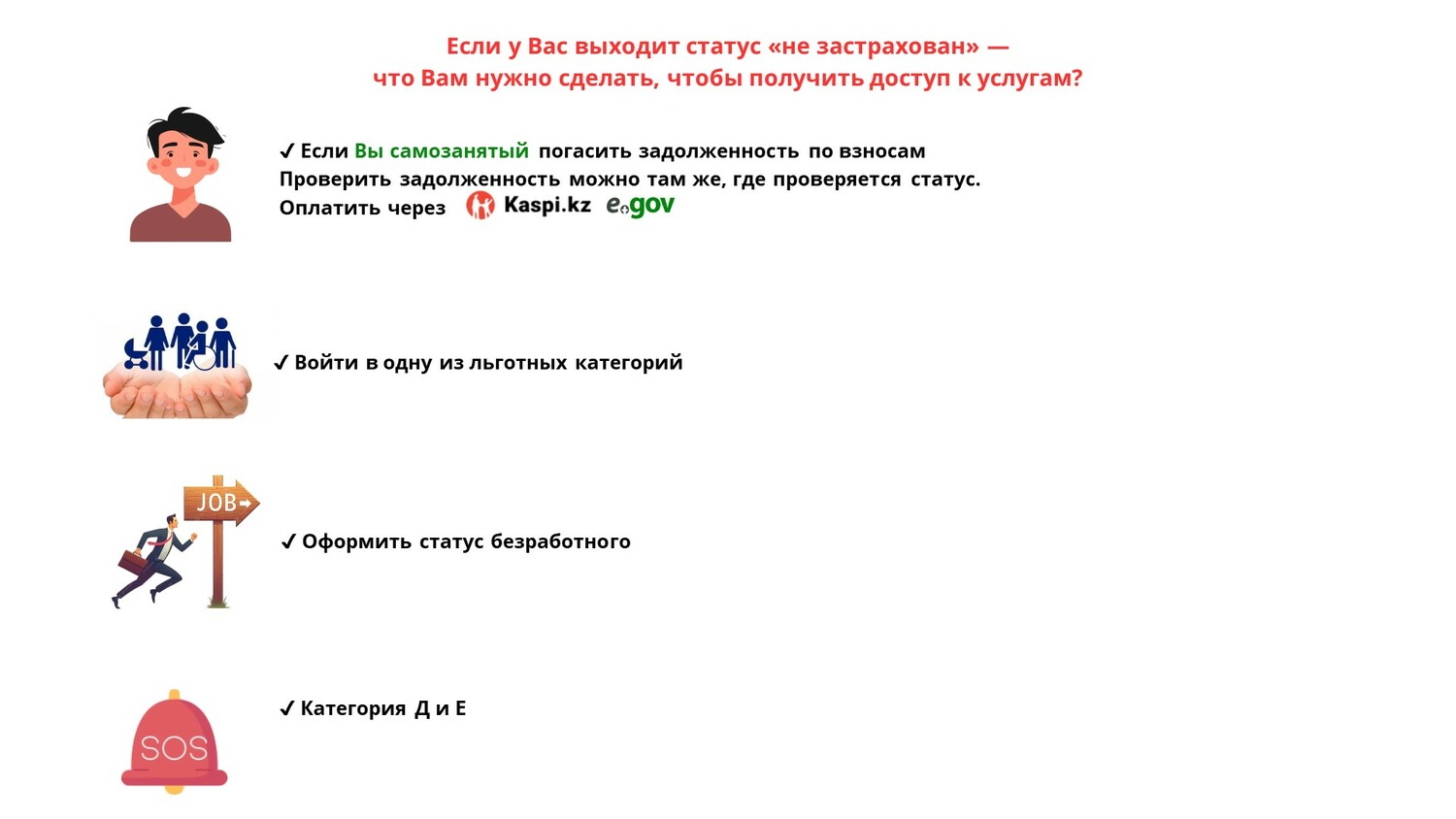 Люди, имеющие статус застрахованности в системе ОСМС, получают расширенный доступ к медицинской помощи обязательного социального медицинского страхования.
